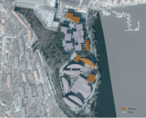 Gråfärgade byggnader inom planområdet föreslås rivna. Byggnader som bevaras (bruna) är Vita villan, Chaufförsbostaden, Laboratoriet, Båghuset, Fabriken samt kontorshus 2 och 3. (Illustration ur planbeskrivningen/ Tyréns)