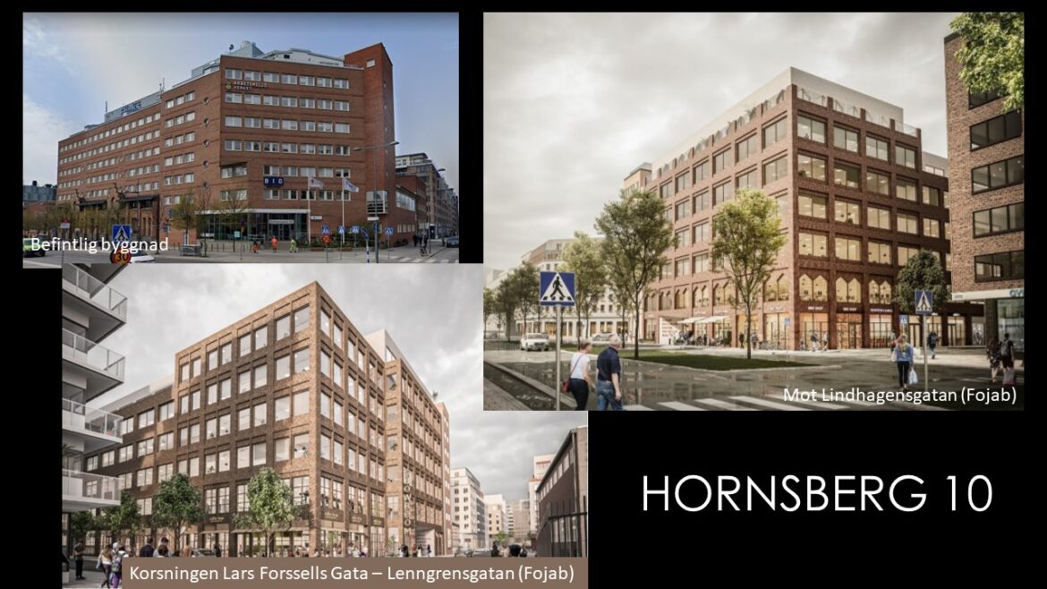 Samfundet S:t Erik ställer sig i grunden positivt till en utveckling av kontors- och centrumverk­samhet inom fastigheten. Det är positivt att projektet ser kvaliteter och möjligheter i bevarande av befintlig kontorsbyggnad från 1980-talet med den säreget inkorporerade stallfasaden från 1890-talet, ritad av Kasper Salin. Det är viktigt att påpeka att dessa i den fortsatta planprocessen, inte bör värderas och bedömas som två enskilda byggnadsverk utan som en integrerad helhet från den postmoderna tiden som präglades av sitt intresse för historisk arkitektur och byggnadskultur. I kvarteret Hornsberg tar det sig till uttryck på ett något pliktskyldigt och hårdfört sätt, i en form som har få motsvarigheter i Stockholm.