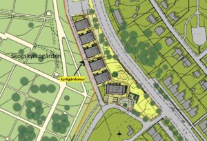 Samfundet S:t Erik avstår från synpunkter beträffande byggnadernas utformning men anser att ”den föreslagna nybebyggelsen har en placering som gör att utblickarna från Skogskyrkogården påverkas mycket negativt. I och med att det i just denna del inte finns särskilt mycket träd blir detta särskilt påtagligt. Upplevelsen av den pampiga muren, både inifrån kyrkogården och utifrån, förtas totalt på detta avsnitt. Förslaget strider enligt Samfundets S:t Eriks bedömning helt mot PBL 2 kap. 6 §, (…). Läs hela yttrandet här: https: https://drive.google.com/file/d/1AkGDY2cRk5fAFt8_Ay4NXxjopcP2zElT/view